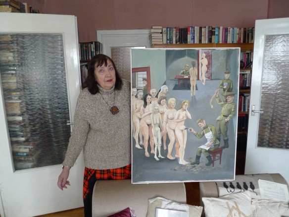 The artist Helena Celmina with a painting from the women’s prison camp in Mordovia. Russian prison officers cut off the hair of all female prisoners.